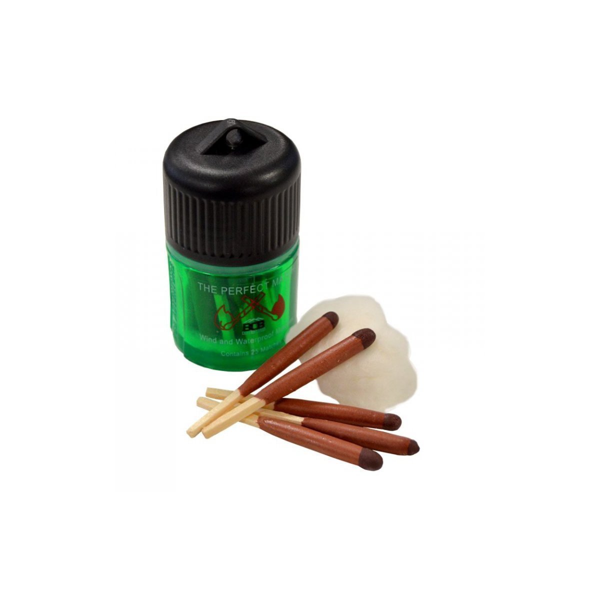 1 boîte de 25 allumettes bougies tout temps dans un conteneur vert étanche avec un bouchon vis et un grattoir intégré. Ces allumettes ne craignent pas le vent, ni la pluie, ni l'eau et brûlent plusieurs secondes. Idéal en expédition, en mission et en survie. Produit approuvé par l'OTAN.