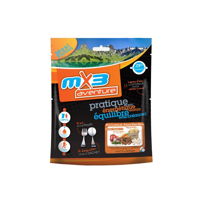 Notre bœuf bourguignon lyophilisé est fabriqué suivant la recette traditionnelle française. C'est un savoureux plat lyophilisé avec un mélange équilibré de morceaux de bœuf fondants, de pâtes, de carottes et de champignons. Le tout avec une délicieuse sauce ! Poids net : 140 g.