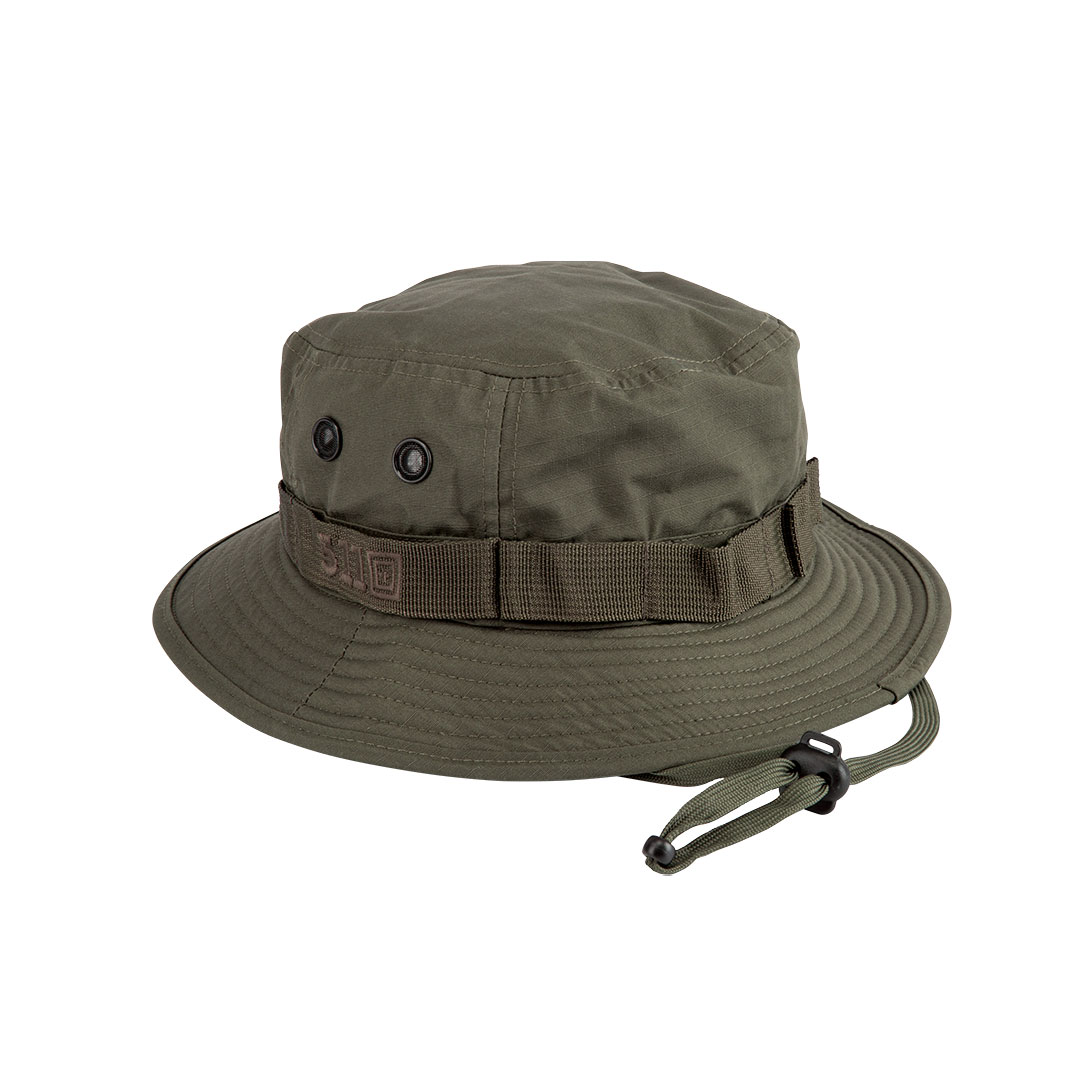 Chapeau de brousse léger et respirant avec une lanière de serrage et le logo de la marque brodé. Restez concentré, quelle que soit l'intensité de la chaleur, avec le chapeau Boonie de 5.11®. Il est fabriqué dans un tissu ripstop en poly/coton TDU® léger mais durable et il comporte des œillets d'aération ainsi qu'un bandeau de transpiration. Oui, il fait chaud, alors apportez votre Boonie pour garder la tête froide.