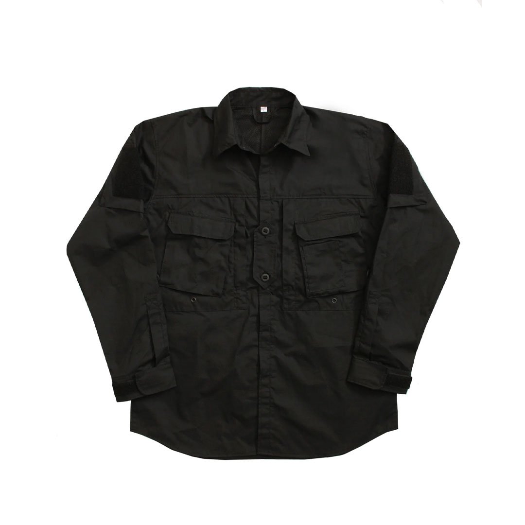Chemise pour climat chaud de type guérilla noire. Elle est équipée d’ouvertures qui facilitent l'aération pendant les activités dynamiques en régions chaudes et humides. Chemise légère indispensable et très fiable pour la jungle et le désert. Son tissu quadrillé est résistant aux déchirures, silencieux et déperlant.