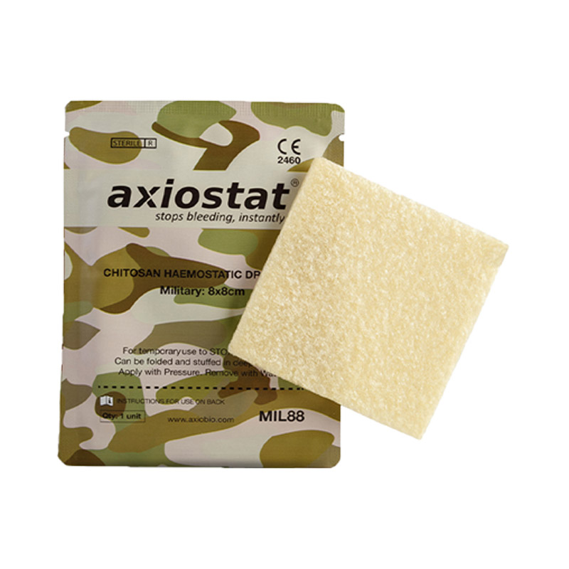 Le patch MIL88 Axiostat est un pansement hémostatique bioactif. Il fonctionne sur un mécanisme unique de mucoadhésion basé sur la charge électrique qui forme une barrière mécanique sur la zone de saignement. La technologie de fabrication n'est pas une compresse imprégnée, mais c'est en 100 % chitosan, sans résidus de poudre ou de réaction thermique. POLYSACCHARIDE naturel composé de nanomères de glucosamine et de N-acétyl glucosamine = Chitosan à charge cationique (+Ve). Le chitosan a été traité pour perdre sa charge acide de (6,4 PH) pour un PH physiologique de (7,4 PH).