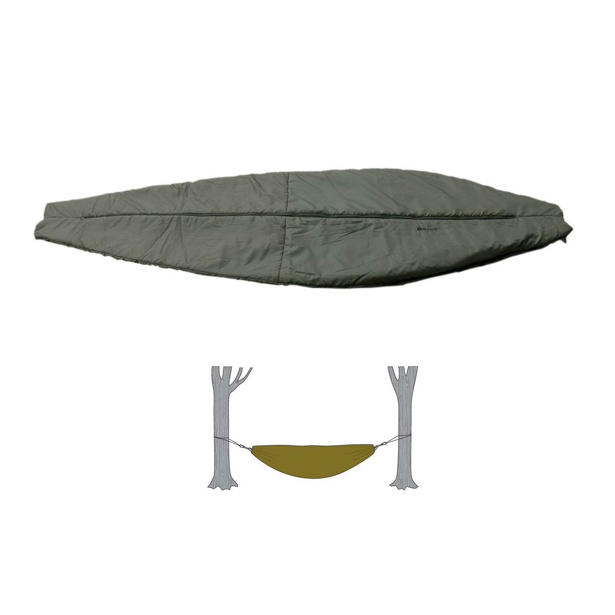 Une solution originale pour s'isoler et garder la chaleur dans son hamac. Un duvet vert olive en forme de cocon avec un zip d'ouverture intégral qui permet un accès facile dedans et dehors. Convient à la plupart des hamacs.