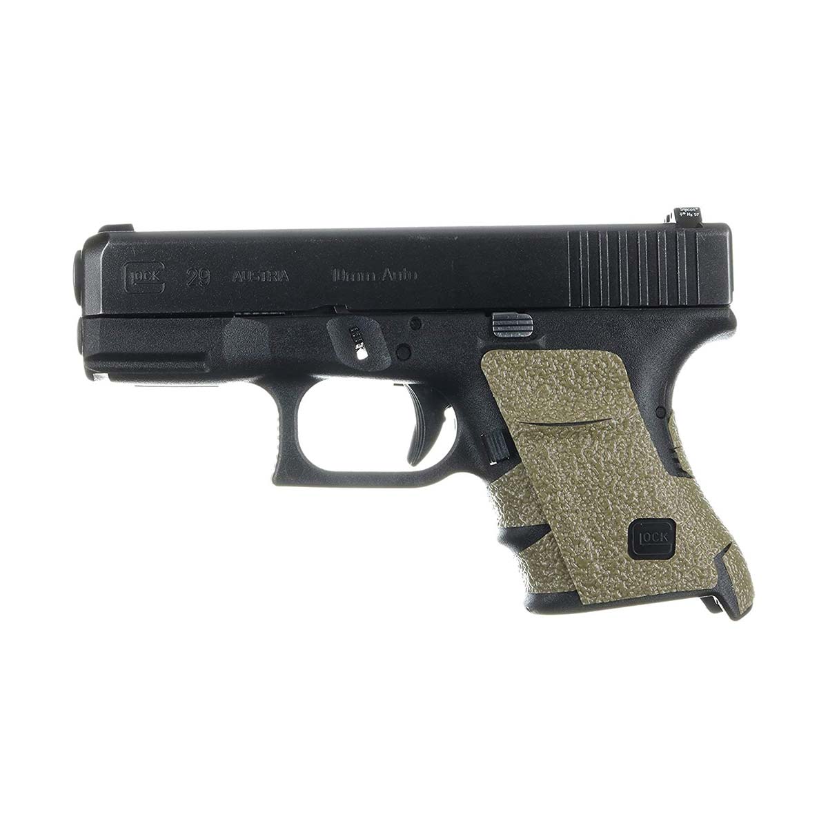 Grip caoutchouc sable pour Glock 29, 30 (gen 4) no backstrap offrant une meilleure préhension en situation tactique ou pour le tir sportif. Le grip enserre complètement la poignée de l'arme mais laisse apparent le logo Glock. Le grip caoutchouc améliore le confort de la poignée pistolet, sans avoir une surface abrasive rendant son utilisation agréable et idéale pour un port discret ou avec un holster inside.