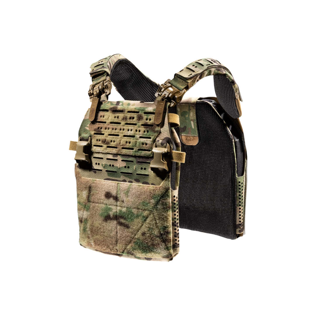 Les zones en contact avec le corps bénéficient d’un rembourrage en mousse à cellules fermées et d’un tissu 3D air mesh perforé pour une ventilation optimale, limitant l’humidité et la chaleur. Les poches porte-plaques Open Top garantissent une compatibilité avec la majorité des plaques balistiques du marché et facilitent l’accès pour le montage des poches frontales.