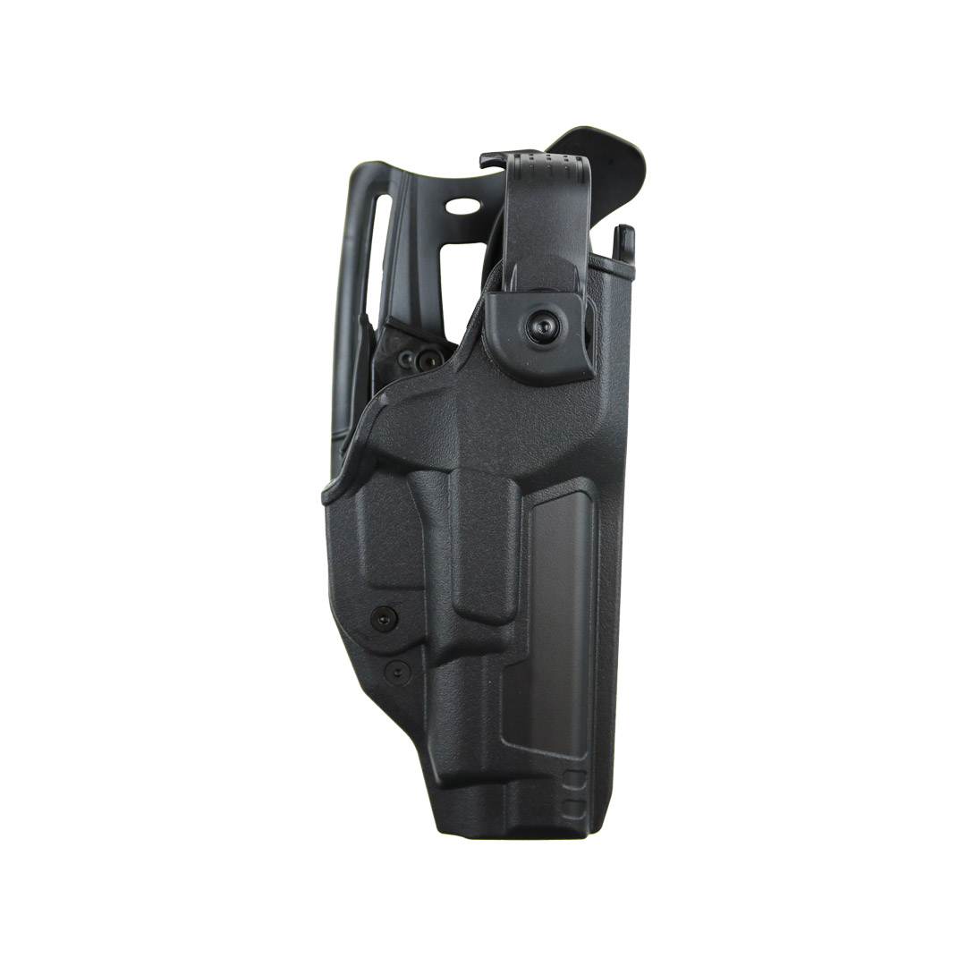 Lors de la saisie de la crosse, la simple pression du pouce sur la pédale de libération (système Evolock-s) libère l’arme et fait basculer l’étrier de sécurité (Rotoloop-s). Ce dernier revient automatiquement en place lors du rengainage, garantissant sécurité et rapidité d’action. La languette anti-arrachement avant (Roto Guard), le réglage de la rétention par vis (STR) et la plaque de protection BS-Pro complètent ce dispositif de sécurité maximal.