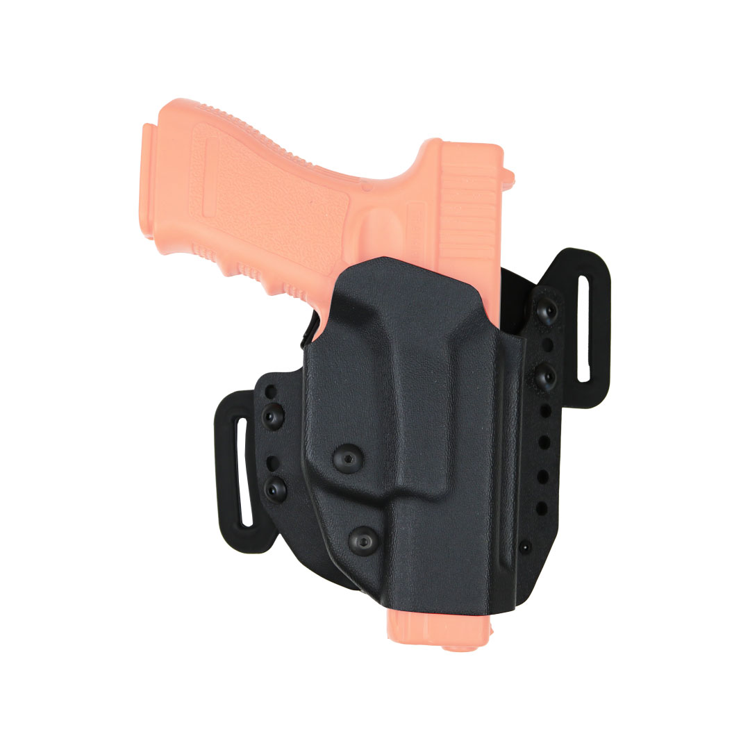 L'holster discret C-Flat de Radar 1957 est conçu pour transporter un Glock 17 ou 19 en toute sécurité, que ce soit en service ou en civil. Grâce à son profil fin et rapproché du corps, il reste très discret et ergonomique. Le système de rétention de niveau II repose sur un bouton LTG situé à l’intérieur de l’étui, empêchant toute manipulation extérieure indésirable et assurant une protection fiable. Son système de fixation MMS (6500.01) permet une compatibilité avec différents types de ceintures, notamment les ceintures de service jusqu’à 40 mm et les ceintures discrètes. L’inclinaison du port peut être ajustée grâce aux points de fixation latéraux, offrant la possibilité de porter l’arme droite ou légèrement inclinée selon les besoins opérationnels. Fabriqué en polymère haute résistance, ce holster combine robustesse, confort et sécurité.