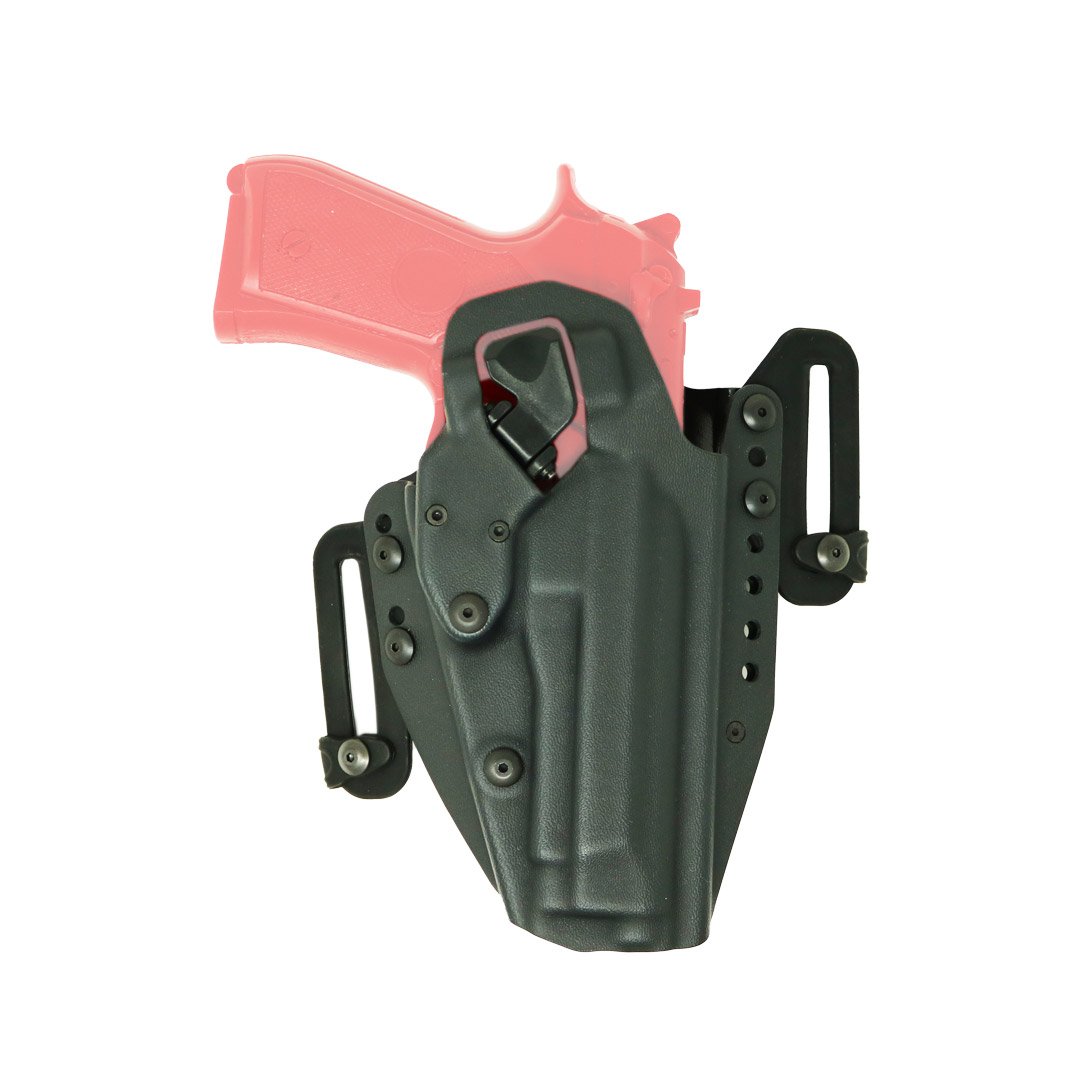 L'holster LTG-PRO Beretta 92-98F en Kydex permet un transport dissimulé de l'arme à la ceinture en tenue civile. Il possède le système de rétention LTG, une pédale pour l'index qui permet l'extraction de l'arme. La particularité de l'Holster LTG-PRO, est que, lorsque l’arme est sortie de l’étui, l’index de l’opérateur se retrouve naturellement aligné sur la carcasse du pistolet et non sur le pontet ou la queue de détente. La position de l'Holster à la ceinture, peut être rehaussé et incliné grâce au système MMS. Les deux passants de ceinture Rubber-Tech peuvent se retirer pour être fixé sur différents points prédéfinis sur le côté de l’étui. Ces variations joueront sur la position et l’inclinaison du port de l’arme selon les choix de l’opérateur.
