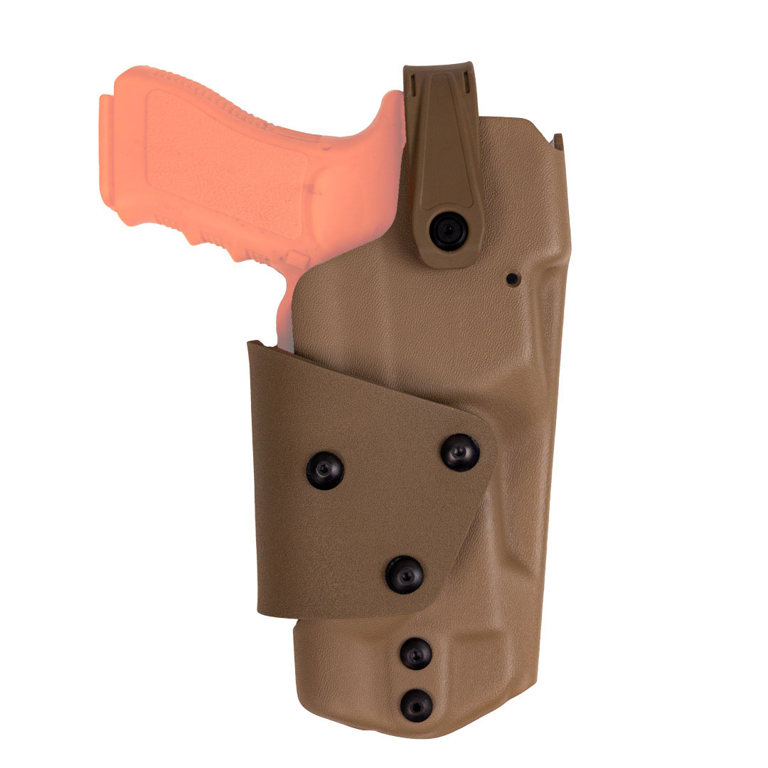 Voici un étui de transport en KYDEX avec une rétention de niveau 3 pour un pistolet GLOCK 17 équipé d’un système d'aide à la visée avec une lampe tactique. L'holster est fourni avec 2 enveloppes afin de pouvoir utiliser une grande partie des lampes tactiques existantes sur le marché. Il est pourvu de 3 rétentions et il est fourni avec un déport bas S-Closer 3x120° pour une installation sur la ceinture.