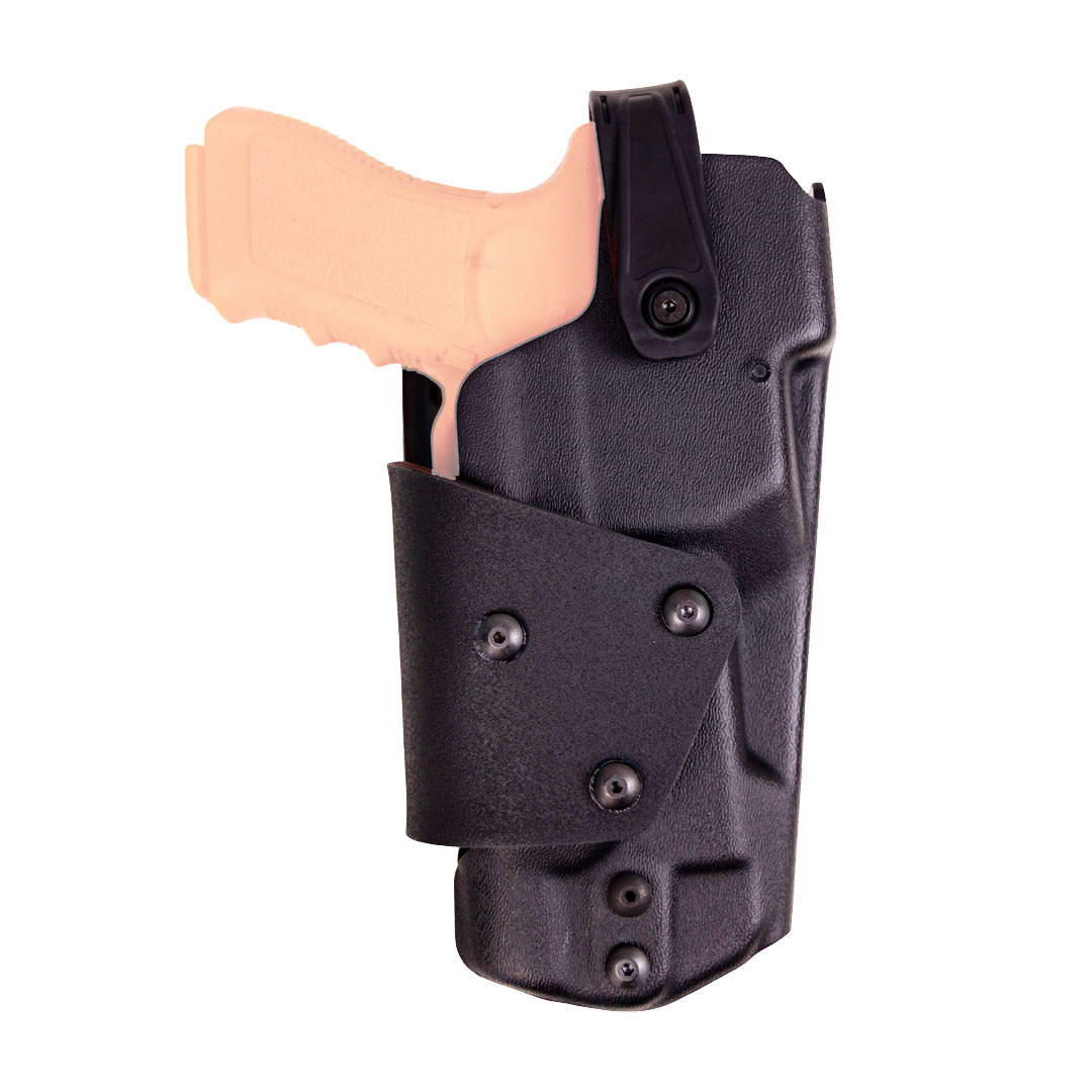 Voici un étui de transport en KYDEX avec une rétention de niveau 3 pour un pistolet GLOCK 17 équipé d’un système d'aide à la visée avec une lampe tactique. L'holster est fourni avec 2 enveloppes afin de pouvoir utiliser une grande partie des lampes tactiques existantes sur le marché. Il est pourvu de 3 rétentions et il est fourni avec un déport bas S-Closer 3x120° pour une installation sur la ceinture.