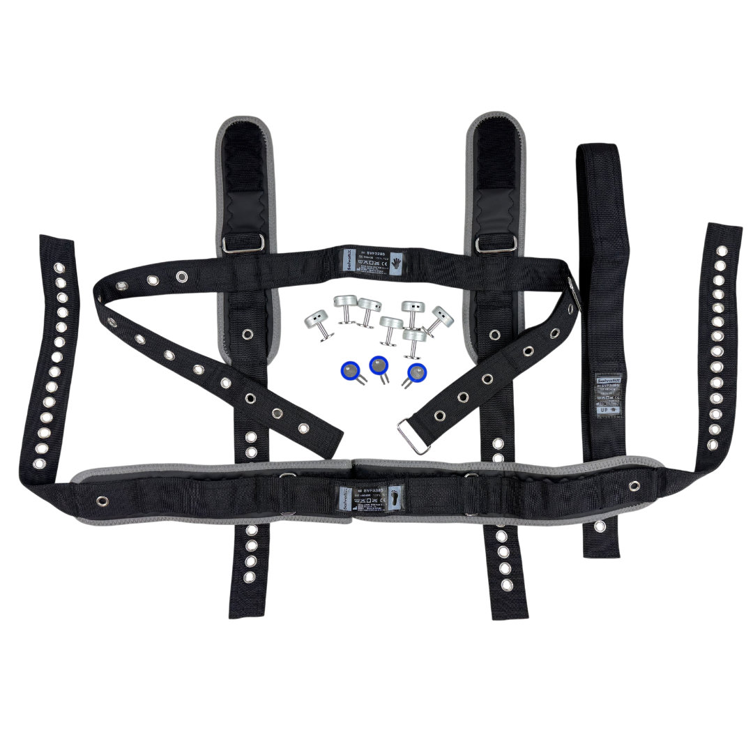 Ce dispositif se compose d’un ensemble de poignets ambulatoires, d’un ensemble de chevilles ambulatoires et d’une sangle de jonction reliant les membres à la ceinture. Cette configuration assure une répartition équilibrée des contraintes tout en conservant une liberté de mouvement limitée et maîtrisée.