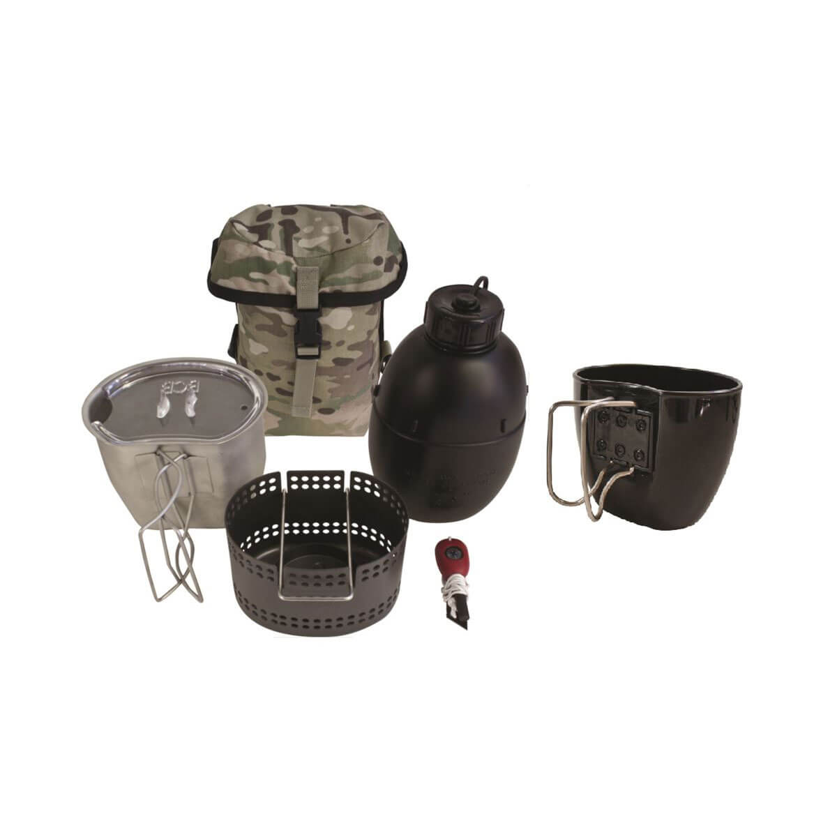 Kit complet de l'armée britannique comprenant le nécessaire pour manger et s'hydrater sur le terrain.