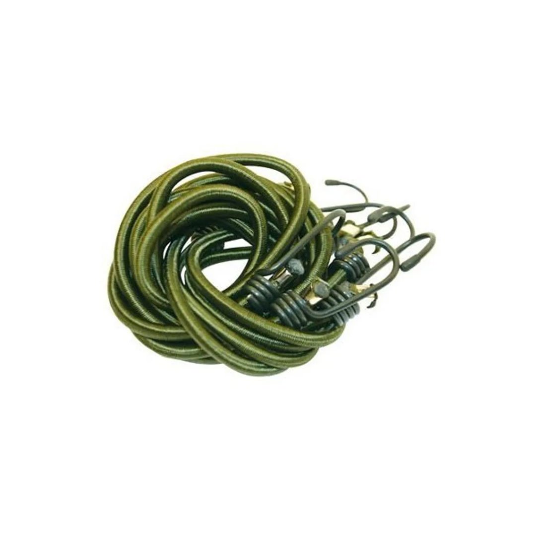 Lot de 4 tendeurs élastiques de couleur vert olive. Tendeurs très robuste de 1 mètre avec de solides boucles en métal pour de multiples utilisations. Idéal pour sécuriser ses équipements sur son sac à dos par exemple ou pour tendre sa bâche sur le terrain.