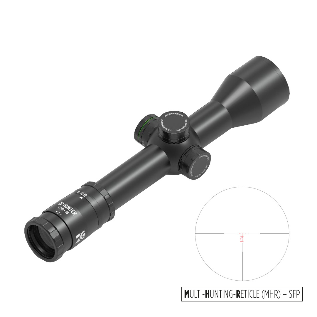 La ZC Hunter 1.7-12x50 est la lunette de visée polyvalente haut de gamme, parfaite pour les chasses en mouvement, en battue et à l'affût. Avec un champ de vision de 23 m à un grossissement de 1,7x, elle offre le plus grand champ de vision en combinaison avec un objectif de 50 mm. Le grossissement jusqu'à 12x et l'objectif de 50 mm permettent d'obtenir une image détaillée, contrastée et nette, même pour les tirs de précision dans des conditions de faible luminosité ou au crépuscule. Le réticule dans le premier plan d'image avec un point lumineux rouge/vert ou avec la technologie d'éclairage diffractée dans le deuxième plan d'image avec un point lumineux rouge simplifie la visée dans toutes les conditions d'éclairage. Pour le réglage du grossissement de 1,7 à 12x, l'oculaire est doté d'une bague de zoom confortable et facile à prendre en main. Pour améliorer la rapidité d'utilisation du zoom, un "levier de trow" est également disponible en tant qu'accessoire. La combinaison du puissant zoom 7x et du réticule dans le 1ᵉʳ ou le 2ᵉ plan d'image rend la ZC Hunter 1,7-12x50 extrêmement puissante et multifonctionnelle.