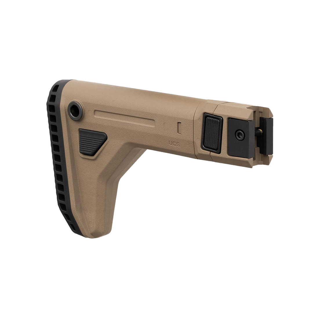 La crosse Magpul UCS (Universal Carbine Stock) en finition FDE (Flat Dark Earth) est conçue pour s’adapter parfaitement aux armes équipées d’un rail M1913 Picatinny vertical à l’arrière du boîtier. Idéale pour de nombreuses plateformes, elle dispose d’une charnière réversible permettant un repli à gauche ou à droite, ainsi que d’un angle de chute de 5° pour un dégagement optimal des poignées d’armement et fenêtres d’éjection.