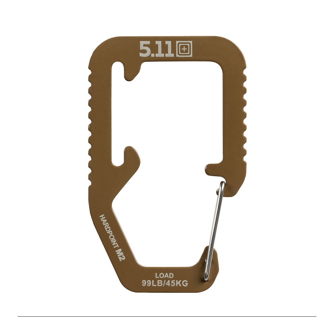 Le mini mousqueton Hardpoint M2 en acier inoxydable avec sa fermeture automatique s'intègre parfaitement sur les passants MOLLE, Hexgrid® ou sur des plateformes porteuses similaires. Les bords sont dentelés pour l'adhérence et la finition est non brillante. La conception des crochets empêche le mousqueton de tourner sur le passant et de toujours rester en place sur la plateforme.