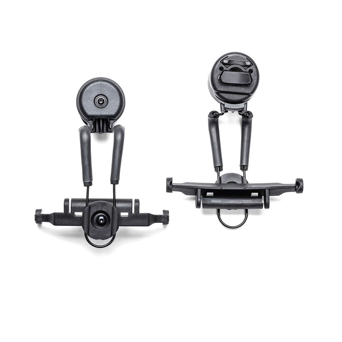 Ce support s’appuie sur des adaptateurs sur rail brevetés assurant une compatibilité optimale avec la conception des casques Team Wendy. L’installation peut être réalisée sur les rails supérieurs ou arrière du casque, offrant une grande souplesse de configuration selon l’équipement porté et les contraintes de mission. Le système s’enclenche directement sur le point de pivot des oreilles NoizeBarrier®, garantissant un maintien sécurisé et un positionnement stable lors des déplacements et des phases statiques.