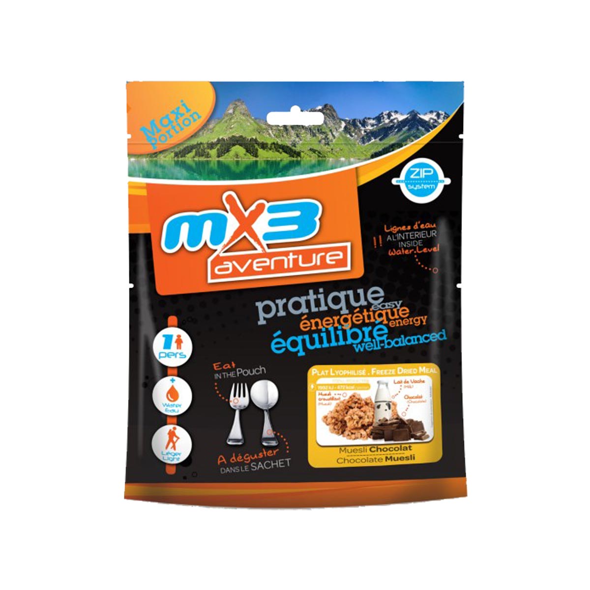 Notre muesli au chocolat est le petit-déjeuner énergétique préféré des aventuriers. Retrouve l'alliance des céréales et du chocolat dans un sachet.