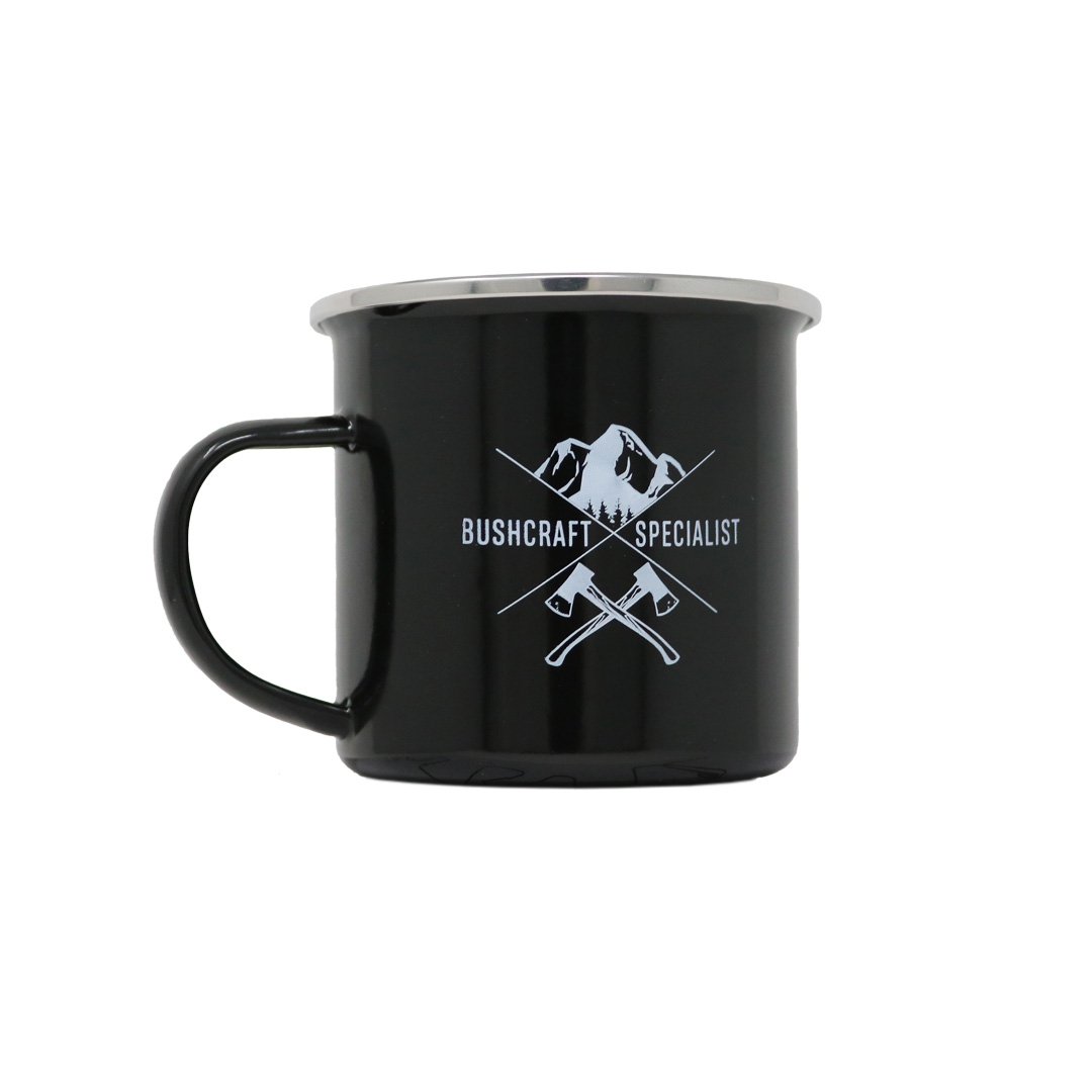 Mug de terrain en métal noir émaillé avec un fond blanc. Il est très robuste, léger, pratique et personnalisé avec des graphiques originaux autour de l'activité du Bushcraft.