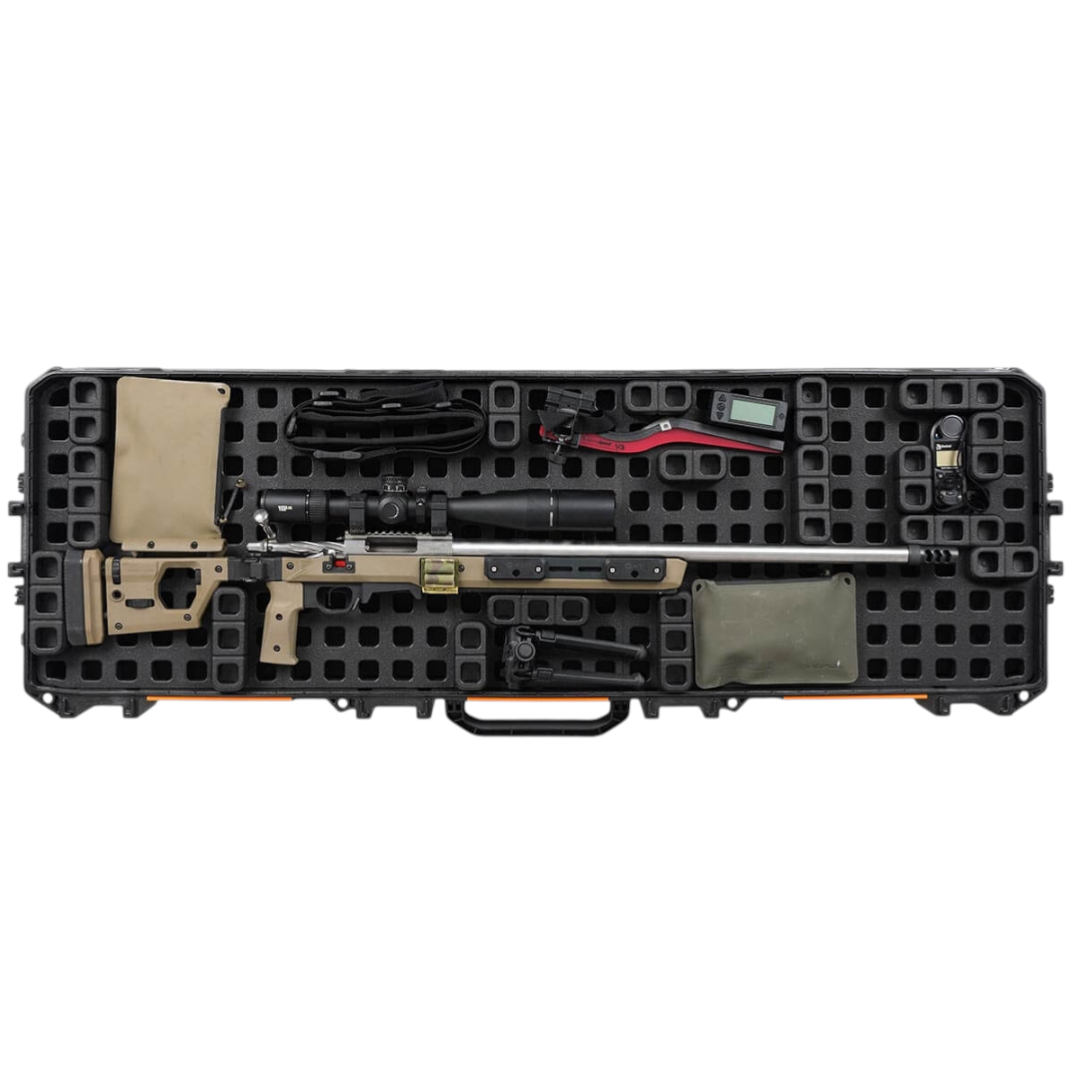 Les panneaux et blocs modulaires s’assemblent facilement pour immobiliser fusils, optiques, accessoires ou équipements sensibles. Le système peut être reconfiguré à tout moment sans outil, permettant d’adapter l’organisation interne de la mallette selon l’équipement transporté ou la configuration souhaitée.