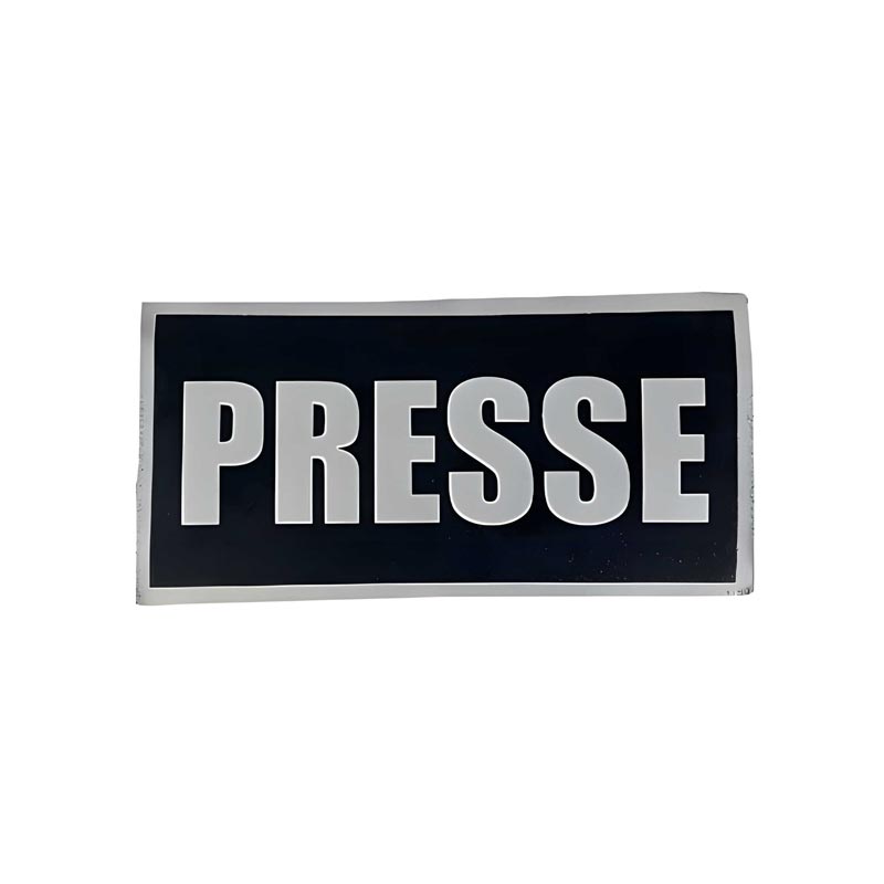 Patch d'identification et de signalisation PRESSE pour les journalistes des médias sur le terrain. Ce patch de taille standard sur fond noir avec un marquage réfléchissant permet d'identifier facilement sur le terrain, les personnels appartenant à la PRESSE.