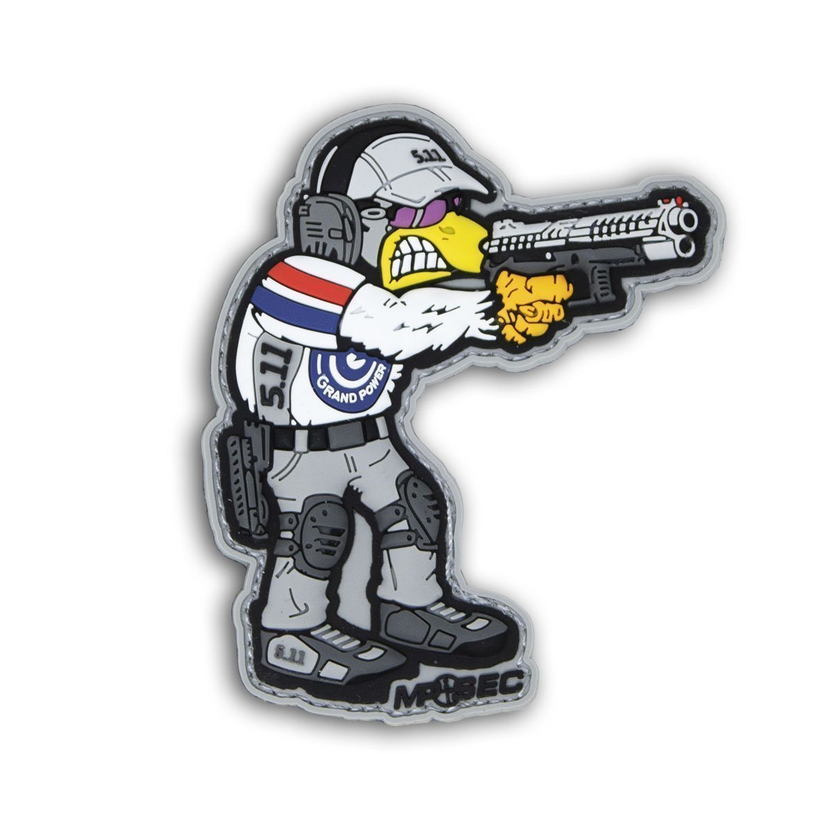 Ce 6eme patch Coq représente un tireur de Tir Sportif de Vitesse. Terräng MP-Sec France est partenaire officiel de la Fédération Française de Tir. Notre mascotte tire donc avec un pistolet Xcalibur Match de Grand Power. Il porte des lunettes Oakley SI, un casque audio Walker's et il est habillé de la tête « aux pattes » en 5.11.