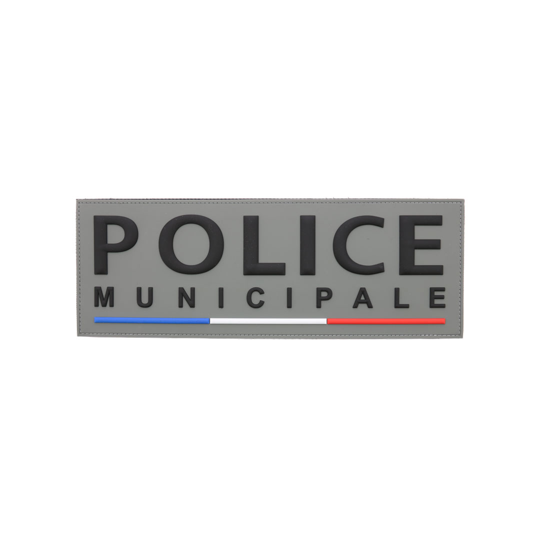 Marquage PVC relief "Police Municipale" autoagrippant dorsal pour vêtements. Lettres noires sur fond gris.