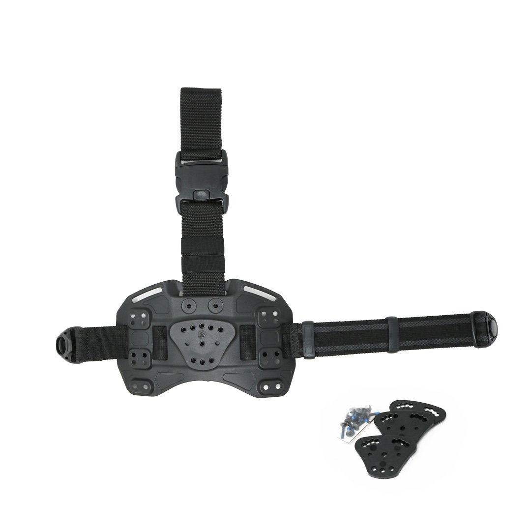 Plaque de cuisse ergonomique et stable sans accessoire avec une sangle de cuisse élastique. La connexion à la ceinture en 2 parties se fait par l'intermédiaire d'un clip pour être dé-clipsable facilement. La plaque est compatible avec tous les étuis et les accessoires dotés des systèmes de fixation Multilink 1 et 2.