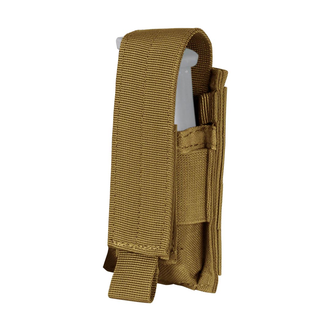 La poche chargeur simple pour 1 seul chargeur PA présente un design universel, afin de s'adapter à tous les chargeurs de pistolet. L'élastique de maintien et la fermeture réglable du rabat supérieur autoagrippant maintiennent le chargeur en toute sécurité. Le rabat de la poche peut également être escamoté et être utilisé en position ouverte. Cette poche chargeur offre un rangement optimal pour la plupart des chargeurs de pistolet. Elle peut aussi être utilisée pour ranger des couteaux pliants, des outils multifonctions, des lampes de poche ou d'autres petits objets essentiels.