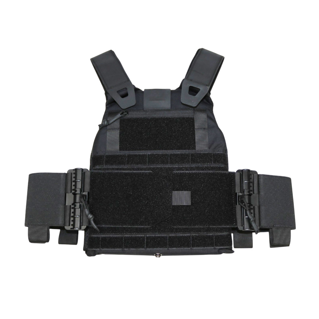 Le cummerbund élastique latéral est équipé d’un système de dégrafage rapide via des boucles à libération rapide visibles sur les côtés. Ce dispositif permet un retrait rapide du porte-plaque lorsque nécessaire. L’ensemble dispose de deux rangées de passants MOLLE auto-agrippants ainsi que de deux passants MOLLE verticaux en nylon, permettant l’ajout d’accessoires MOLLE compatibles tout en conservant un encombrement maîtrisé.