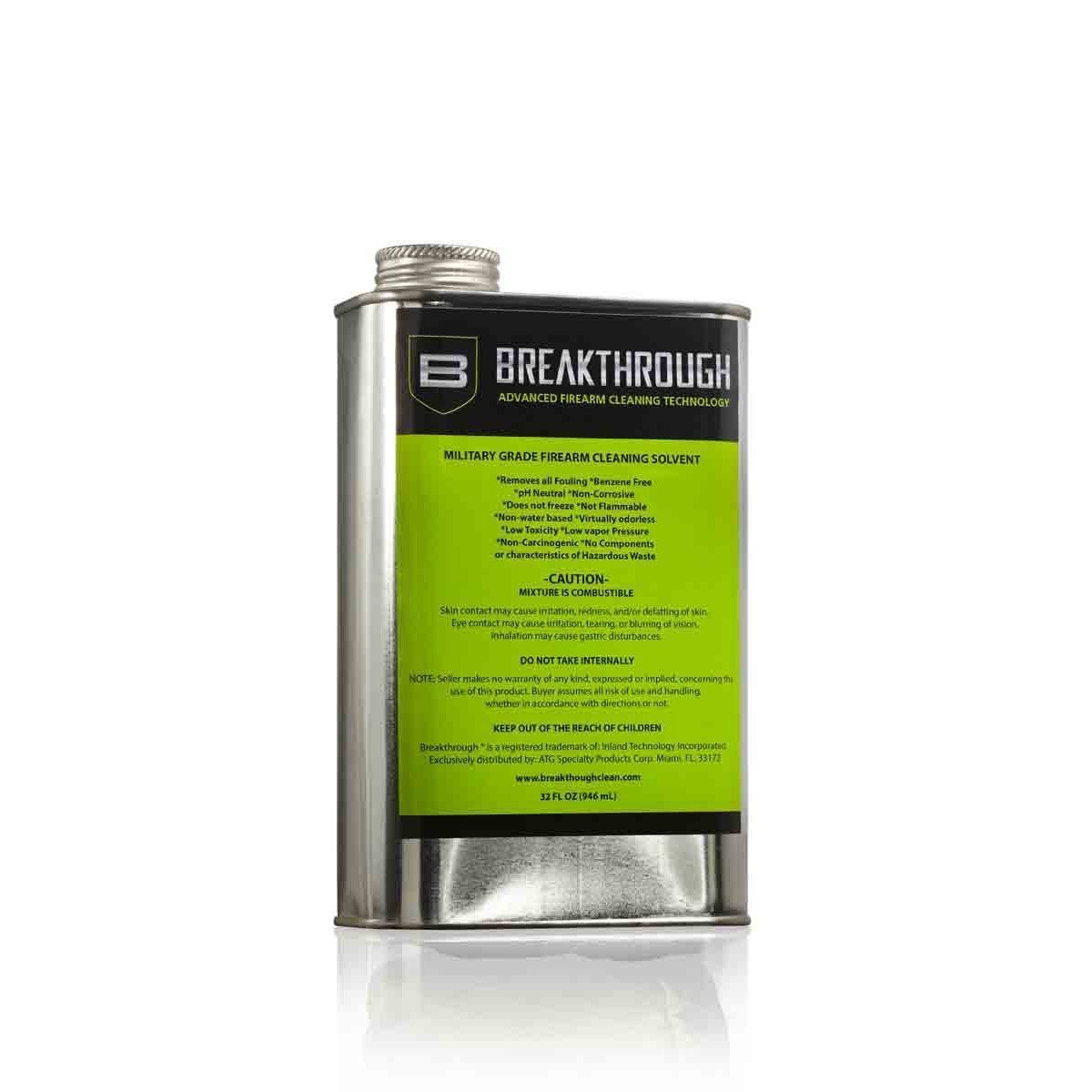 - Le solvant qualité militaire Breakthrough® est inodore, non colorant, élimine totalement l’encrassement, et s'évapore complètement, ne laissant aucun résidu. Son pH est totalement neutre, ce qui n’engendre aucun dégât sur les parties bois, métal, plastique, polymère, cerakote ou water-transfert de votre arme à feu. De plus, contrairement à des solvants classiques, le solvant qualité militaire Breakthrough possède un point d’ignition de 65° C et est donc considéré comme ininflammable. L’efficacité du solvant Breakthrough est inégalée, réduisant de façon drastique la durée du nettoyage tout en consommant moins de produit.