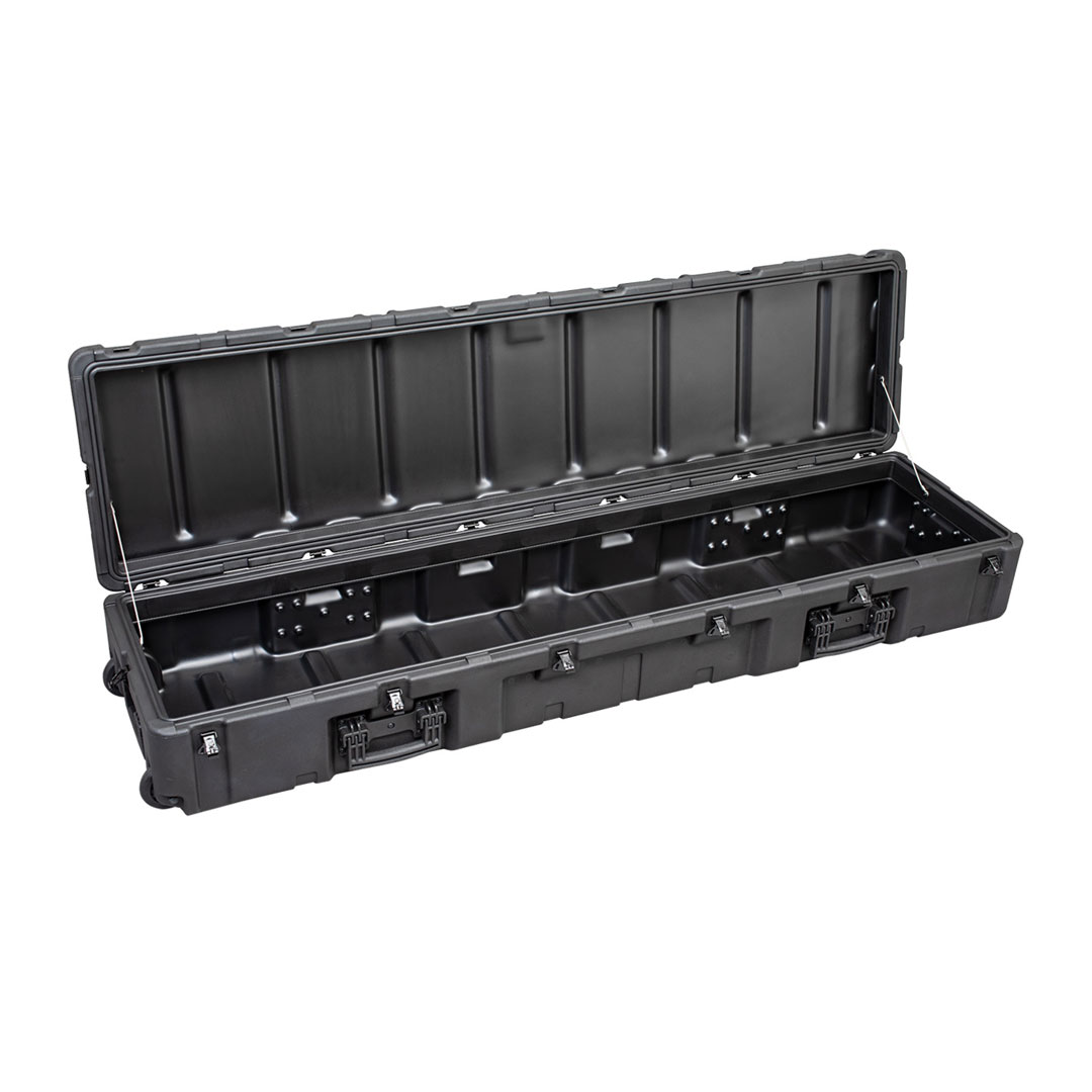 Valise rigide très solide en polyéthylène haute densité réalisée par rotomoulage. Elle possède un joint en PU, un couvercle à charnière avec des supports en acier et 6 poignées pliantes encastrées pour un transport facilité, y compris en cas de valise pleinement chargée. Elle est aussi dotée de 2 roues silencieuses à roulement à billes, de plusieurs systèmes de fermeture papillon métalliques encastrés et cadenassables et de 2 soupapes de pressurisation automatiques. Elle ne possède pas de mousse, livrée vide.