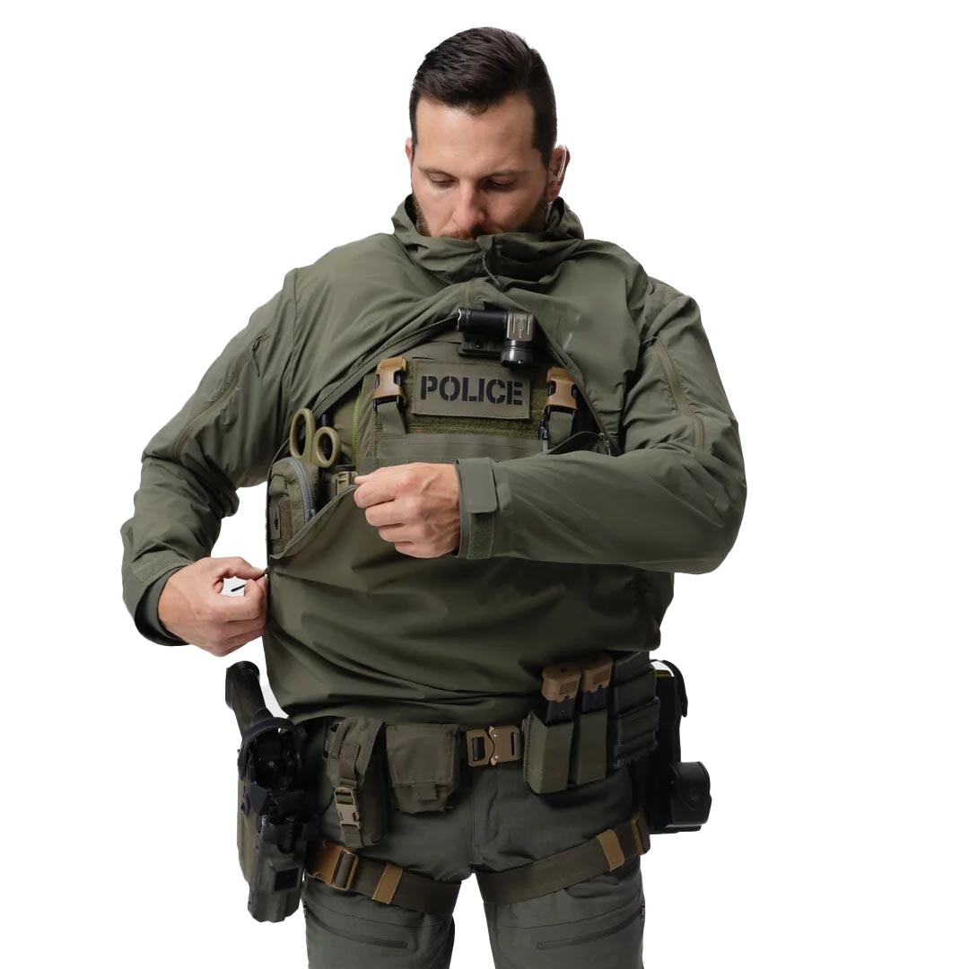Sur veste silencieuse, très légère, résistante aux intempéries et pliable pour les environnements tempérés ou urbains. Elle permet un camouflage et une protection tout en permettant d'accéder facilement à ses équipements en dessous. Ce vêtement coupe-vent, léger et extensible dans les 4 sens, possèdent des panneaux perforés au laser pour évacuer la chaleur lors des mouvements dynamiques dans des conditions chaudes.