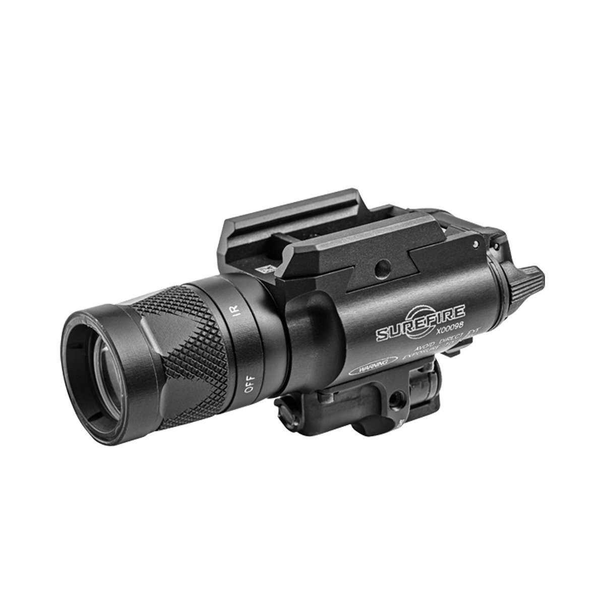 La Surefire X400® combine en un seul système d’éclairage pour arme à feu une lampe LED offrant une lumière blanche et pure, une lumière infra-rouge ainsi qu'un laser IR. Conçue pour les militaires et forces de l'ordre, sa polyvalence est inégalée : passer d'un mode à l'autre se révèle être très facile et se fait par une simple pression et manipulation du sélecteur sécurisé. En mode lampe blanche, le bloc LED, virtuellement indestructible, génère une lumière intense et concentrée de 350 Lumens avec un faisceau clair pour les situations demandant une attention particulière et les identifications de personnels. En mode infrarouge, la LED produit 120 milliwatts de signal infrarouge utilisable avec les appareils de vision nocturne. Il y a aussi un réglage OFF pour le désactiver. Le mécanisme d’ajustement du laser utilise des vis Nylok ® qui ne souffrent pas des effets de recul, cela signifie qu’un resimbleautage est rarement nécessaire. La SF-X400V est livrée avec deux cales d'adaptateurs permettant une fixation rapide sur support universel ou rails Picatinny. Interrupteur ambidextre à bascule permettant un fonctionnement à un doigt pour un allumage momentané ou constant, et un sélecteur de mode vous permettant de sélectionner la lumière blanche seulement,la lumière blanche + laser, laser seul ou alors désactiver le système.